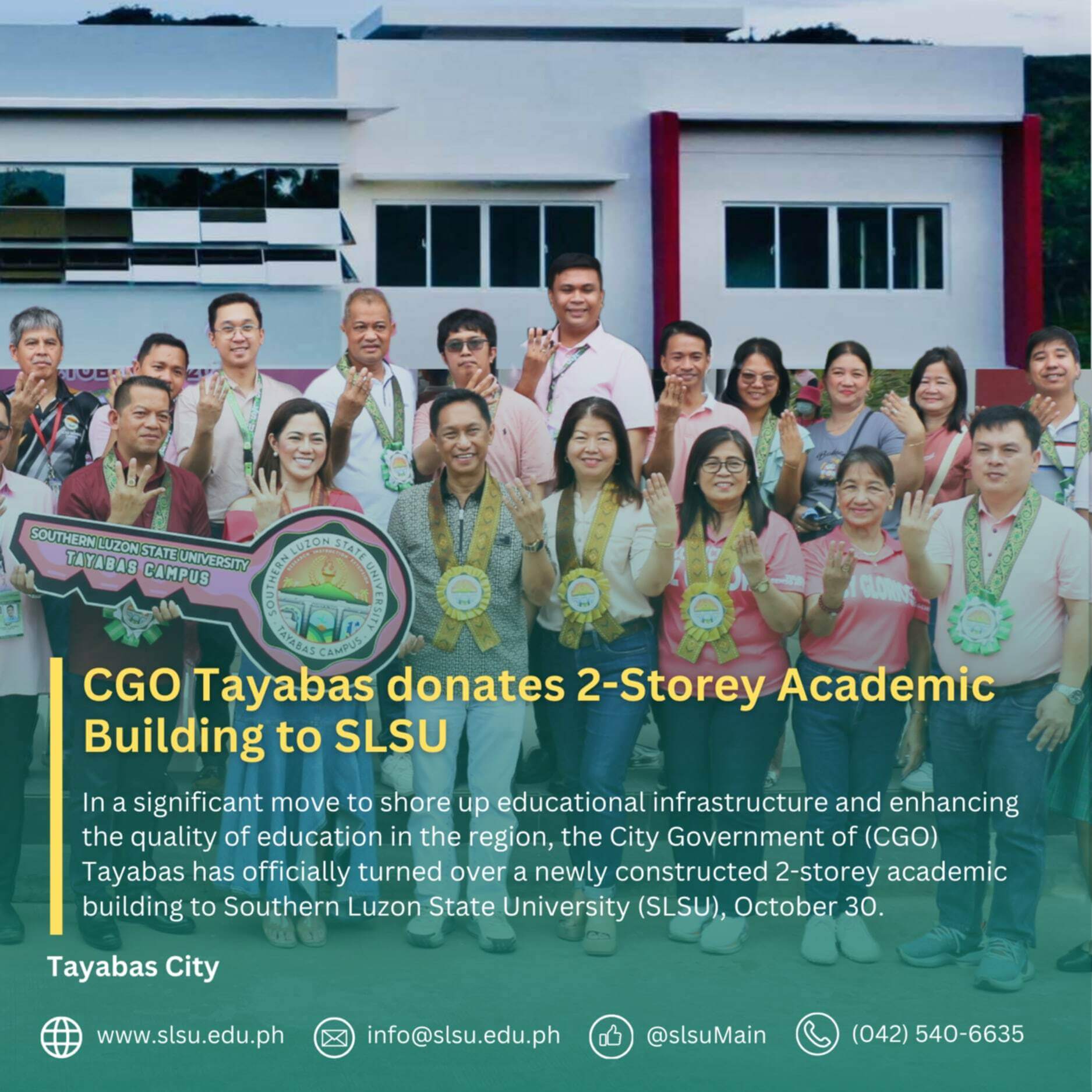 In a significant move to shore up educational infrastructure and enhancing the quality of education in the region, the City Government of (CGO) Tayabas has officially turned over a newly constructed 2-storey academic building to Southern Luzon State University (SLSU), October 30.
