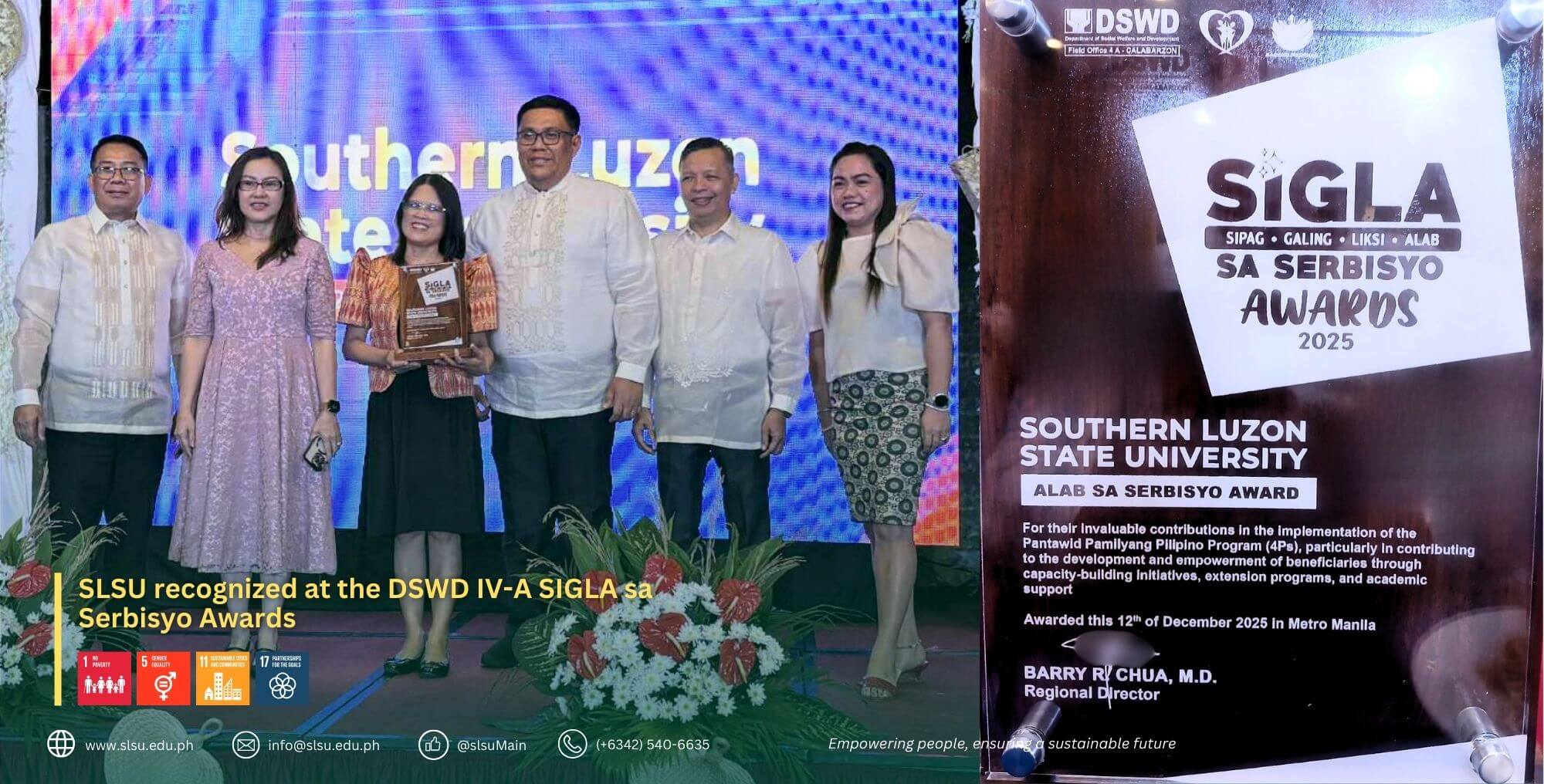 The Southern Luzon State University was one of the awardees for the 2025 SIpag, Galing, Liksi, at Alab (SIGLA) Awards hosted by the Department of Social Welfare and Development Field Office IV-A.
