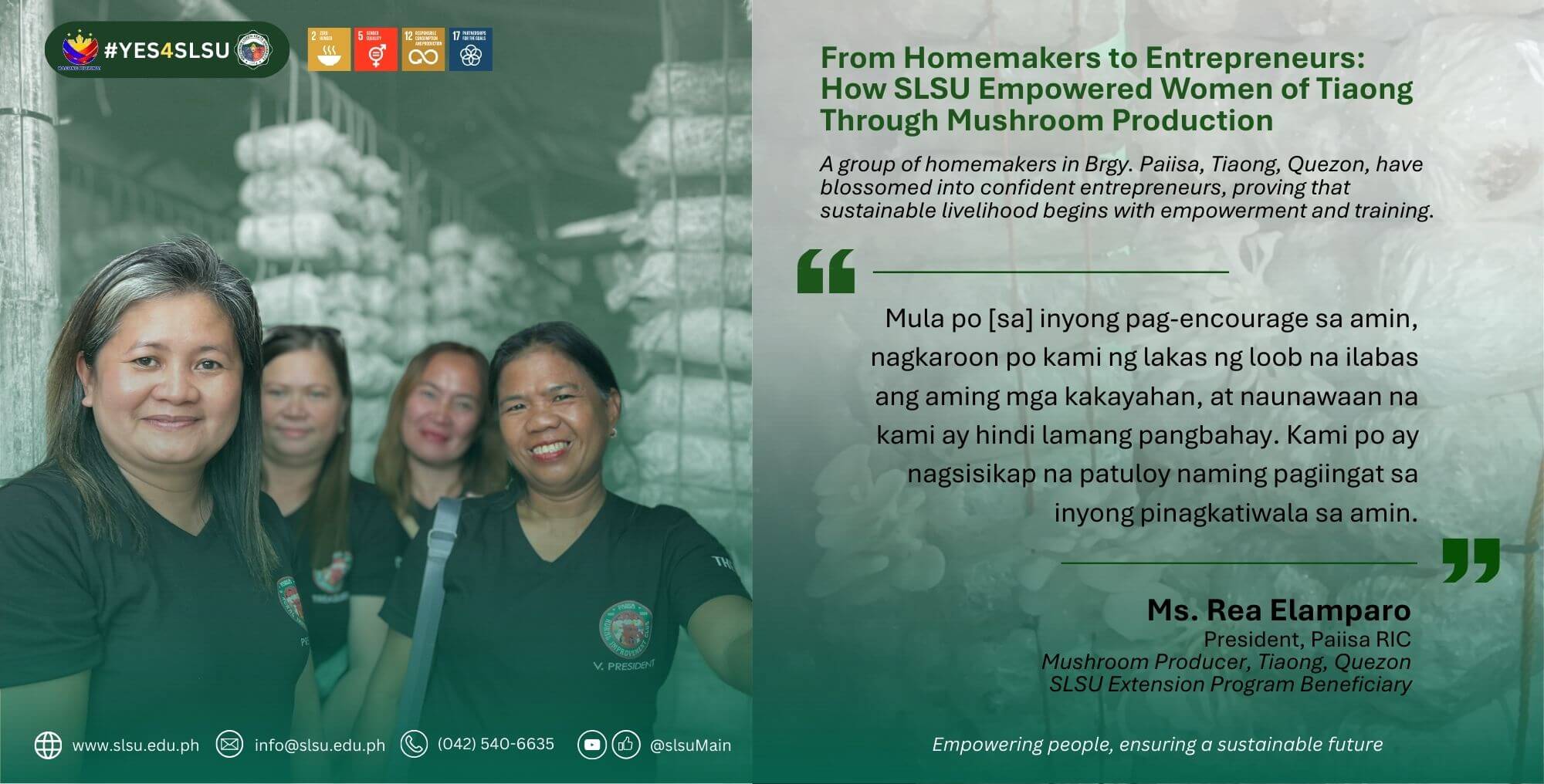 SLSU equipped them with the valuable knowledge and technical skills including hands-on training in mushroom cultivation and production; lessons in value addition, product processing, and effective packaging; as well as market readiness with marketing developing linkages to ensure sustainability.