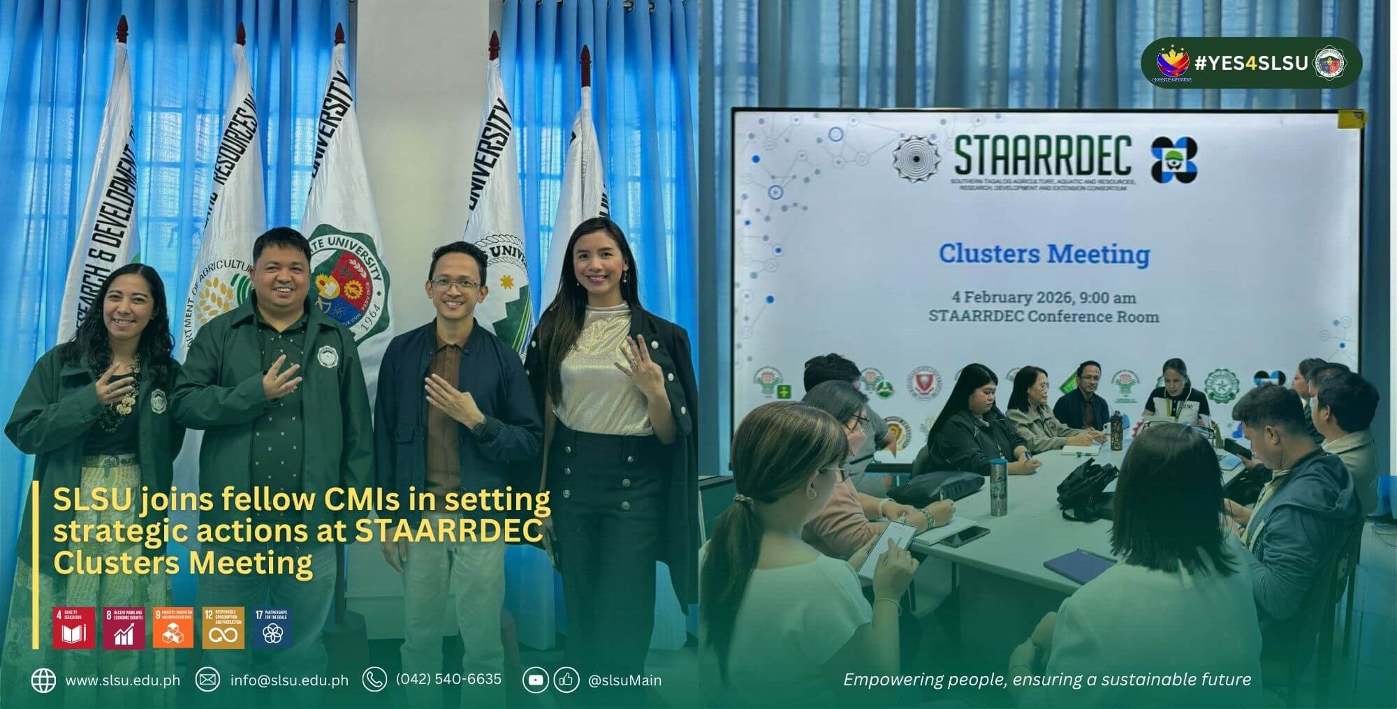 Southern Luzon State University (SLSU) joined fellow Consortium Member Institutions (CMIs) in strengthening regional collaboration and setting shared priorities during the Clusters Meeting of the Southern Tagalog Agriculture, Aquatic and Resources Research, Development and Extension Consortium (STAARRDEC), held on February 04, 2026, at the STAARRDEC Conference Room of Cavite State University – Indang Campus.
