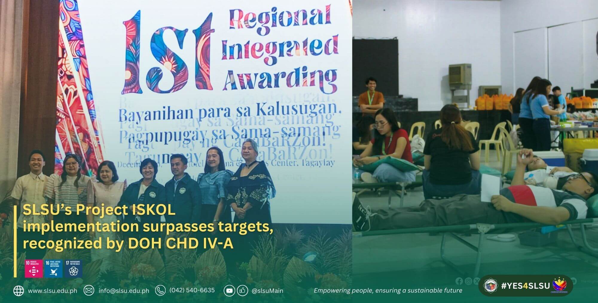 Earlier, on March 26, through the initiative of the University Health Services (UHS) and the Disaster Risk Reduction and Management Office (DRRMO), SLSU earned 2nd place in the Gawad Dugong CALABARZON 2024 for Project ISKOL.