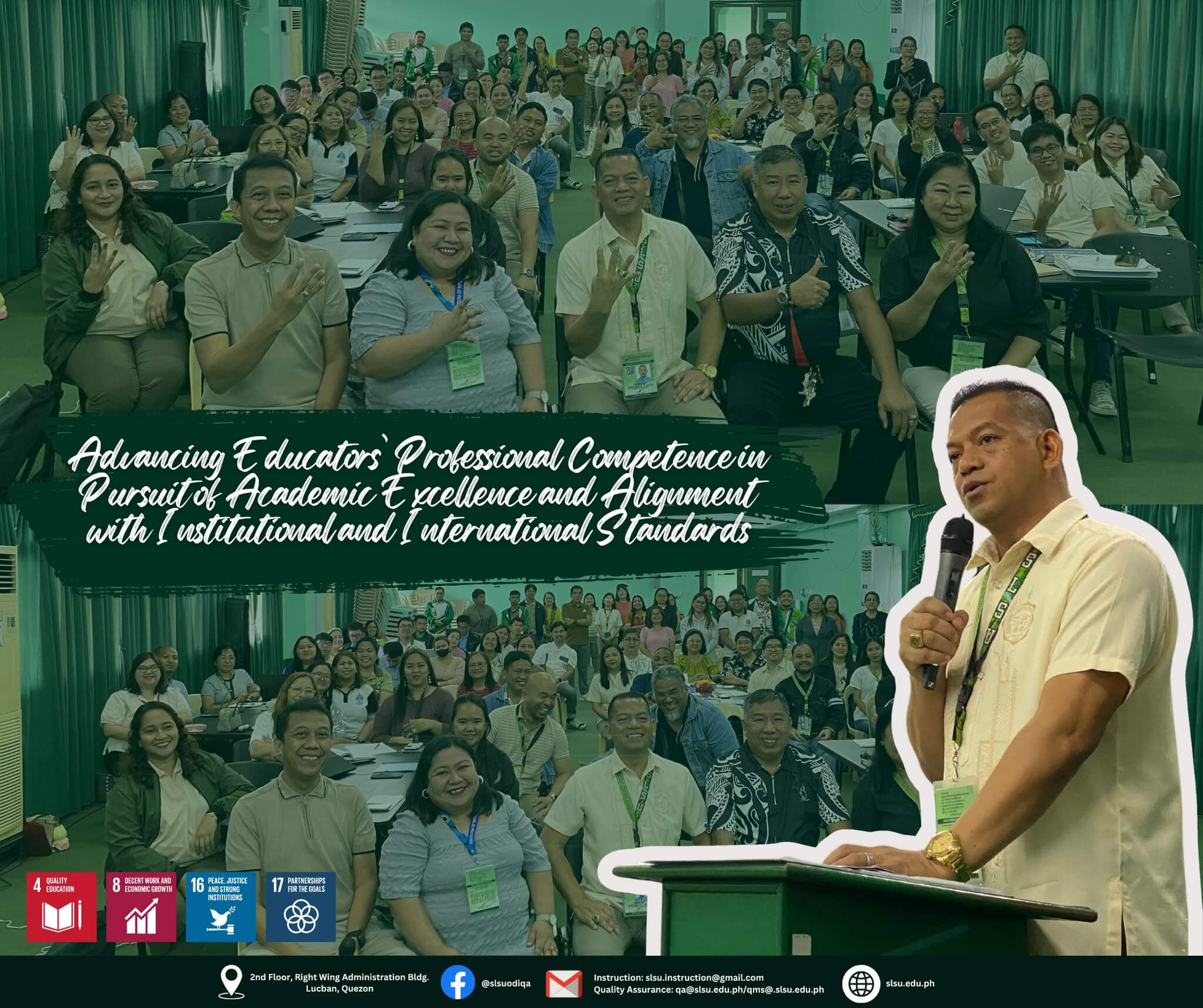 Southern Luzon State University (SLSU) continues to raise the bar for academic excellence and global relevance with a one-day faculty training titled, "Advancing Educators' Professional Competence in Pursuit of Academic Excellence and Alignment with Institutional and International Standards."